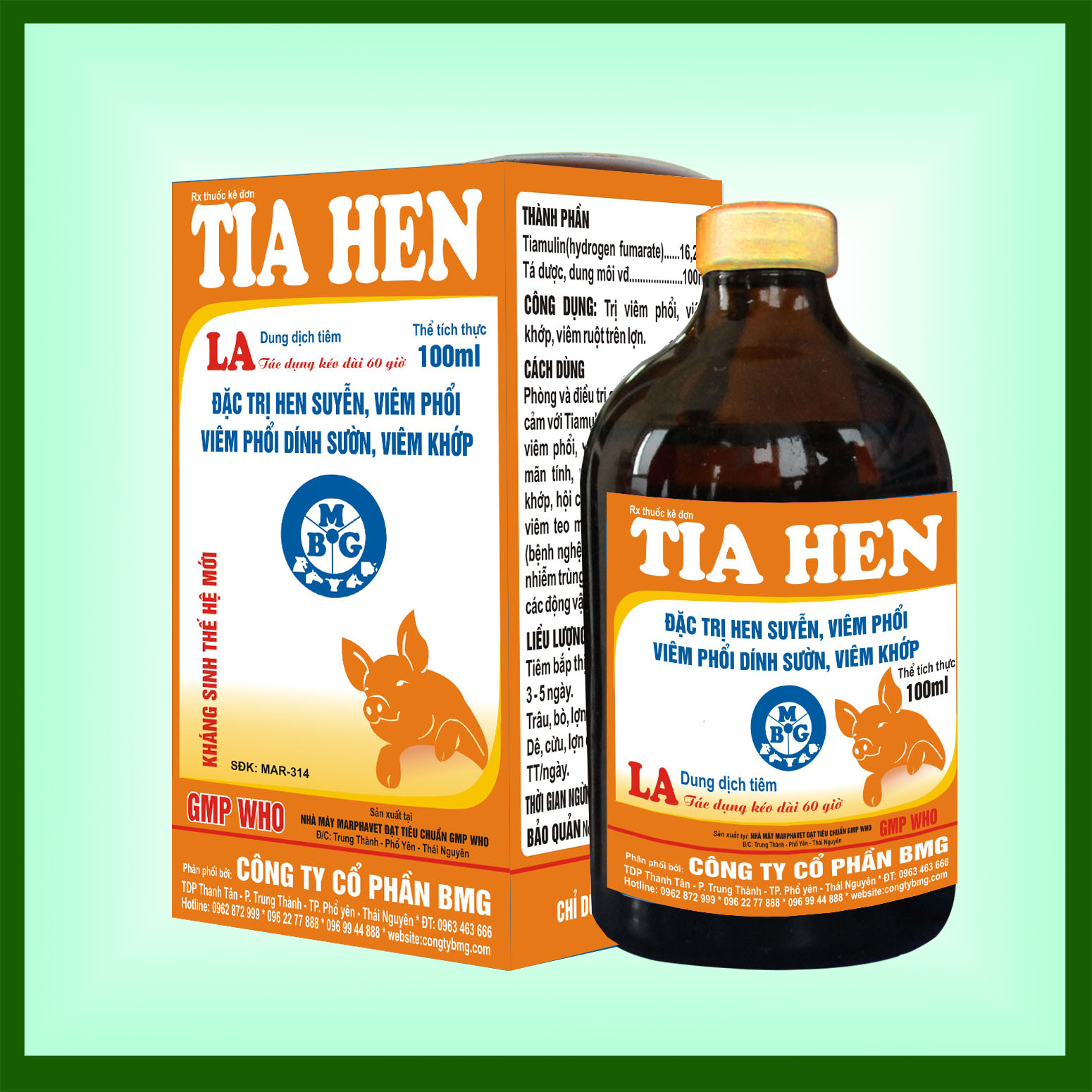 Đặc trị: Hen suyễn, viêm phổi, viêm đường hô hấp cấp, mãn tính, viêm phổi dính sườn, viêm khớp, hội chứng mất sữa truyền miễn, viêm teo mũi, loét da, quăn tai, Lepto. Chống nhiễm trùng sau phẫu thuật đối với các động có vú.